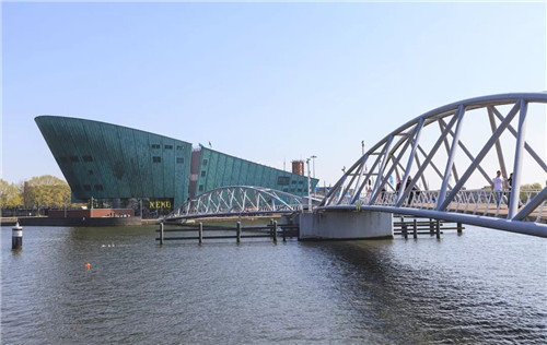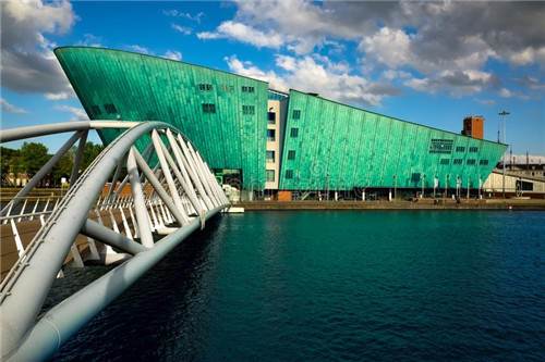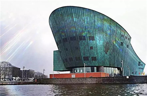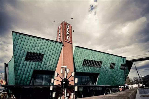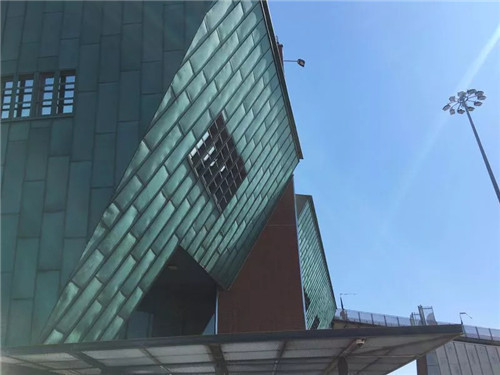 建筑设计上如同正在港口沉没的巨轮,具有很强的标志性,外墙整体采用绿色铜板,立边咬接加上平咬接的构造。船头局部大胆地更换成了一些旧铜板,新旧铜板带来的差异清晰地显现出来,这类设计中有意识地采用一些新旧不一、色泽不一的金属板材按照一定的组合方式从而形成一些意想不到的效果。