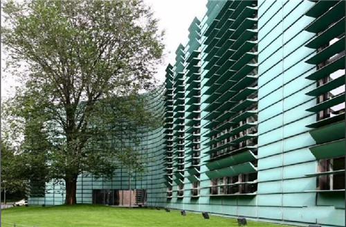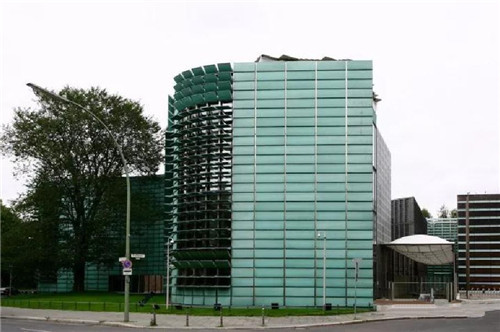 曲折的绿色铜板墙面将多个建筑体块整合在一起,整个建筑群成为一个不可分割的整体。同时,高大的墙体也成为使馆的安全屏障。