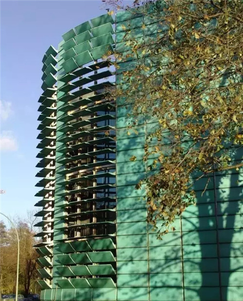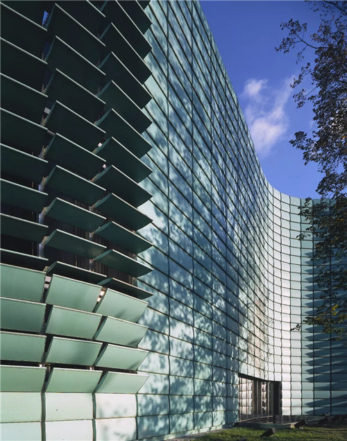 要求合理地结合,同时亦向外阐释这种含义,伯格尔和帕基宁设计了一个由4000片绿色闪亮的铜片组成的14800MM高的铜纽带。形成曲线环绕着除入口立面之外的所有沿街面