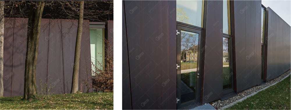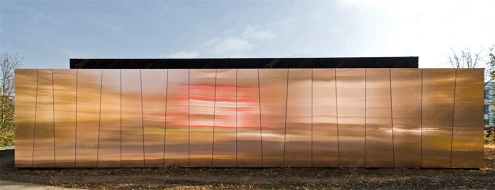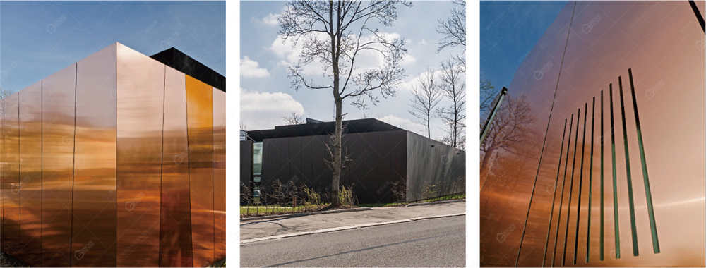 铜板通过固定在不同尺寸的梯形承载板上,边缘使用额外的固定点进行加固。调整板的内部和外部的每个角,使得铜板之间紧密连接,起到很好防水与通风的效果。