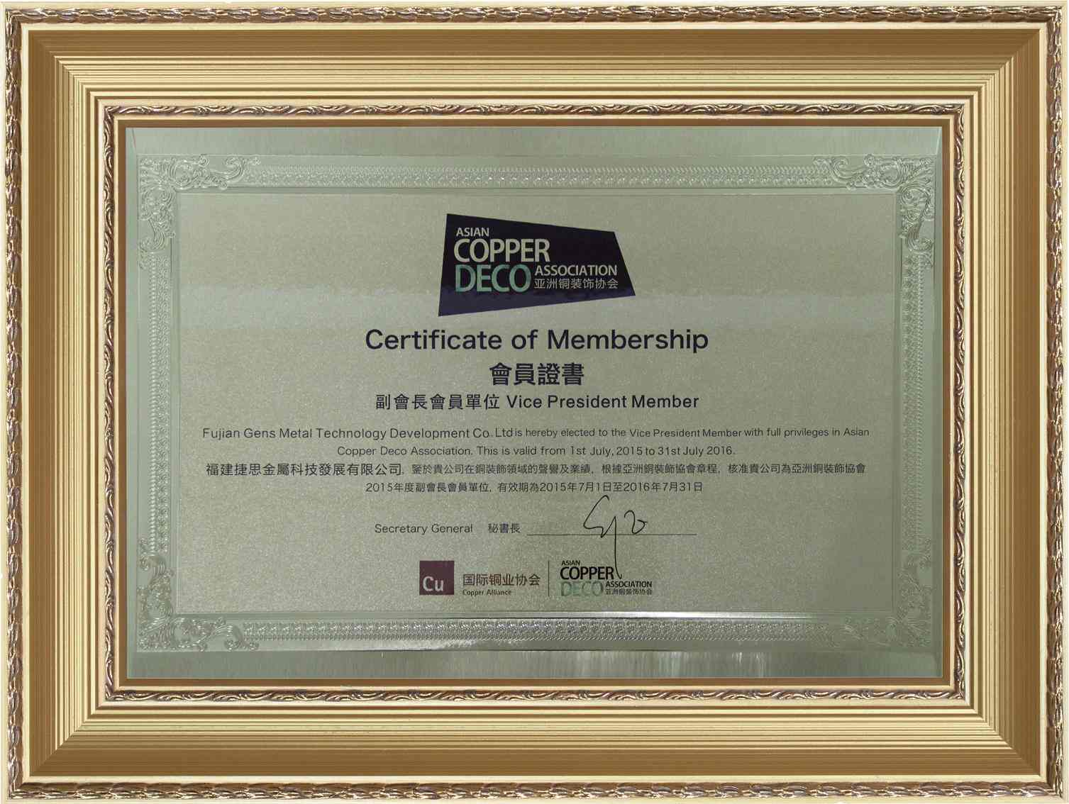 亚洲铜装饰协会副会长证书