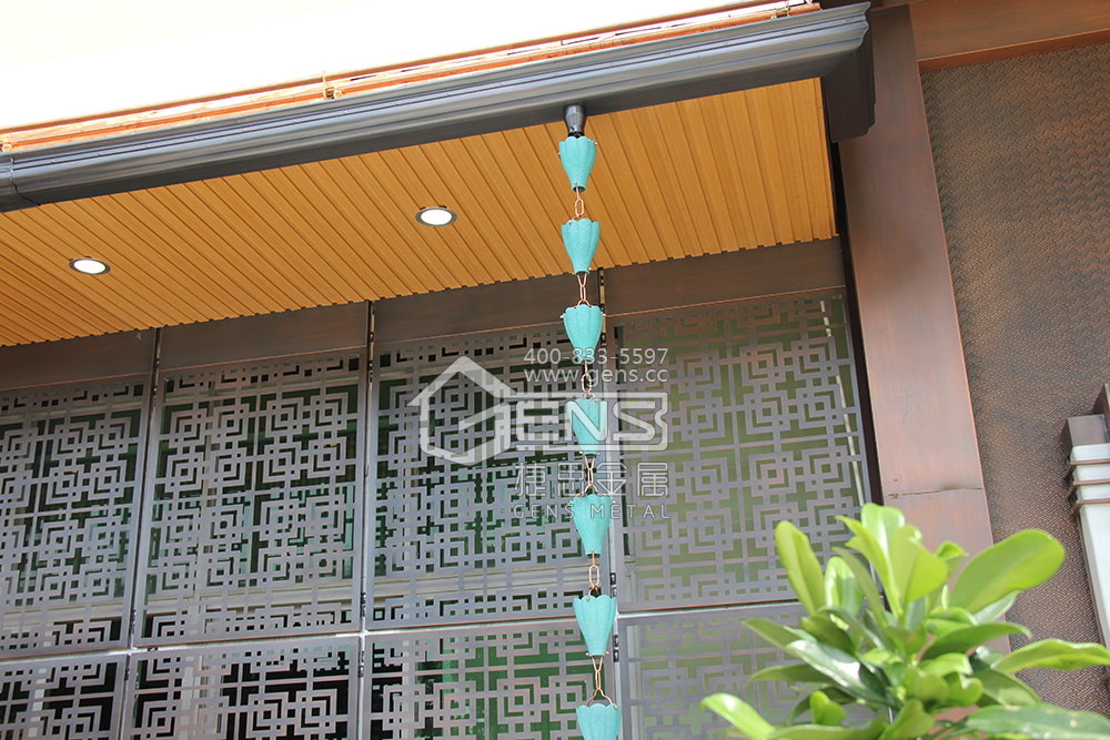 屋檐下清风修竹雨链和着水声倾泻而下,碰撞出的水花营造出视觉的张力,无论是复古铜色还是低调的铜绿,皆温润如玉,自成一股清流。