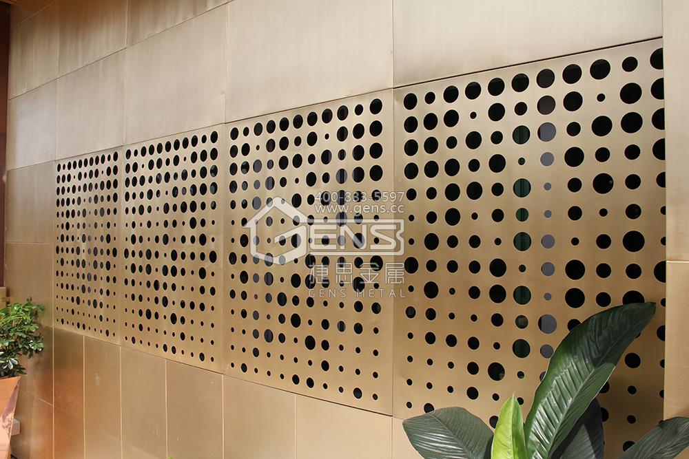 由同样是镂空铜幕墙,不同的是由颜色更加绚丽的黄铜打造,以孔直径不同的镂空圈圈打造的墙面艺术,当阳光洒下,营造出斑驳的美感。