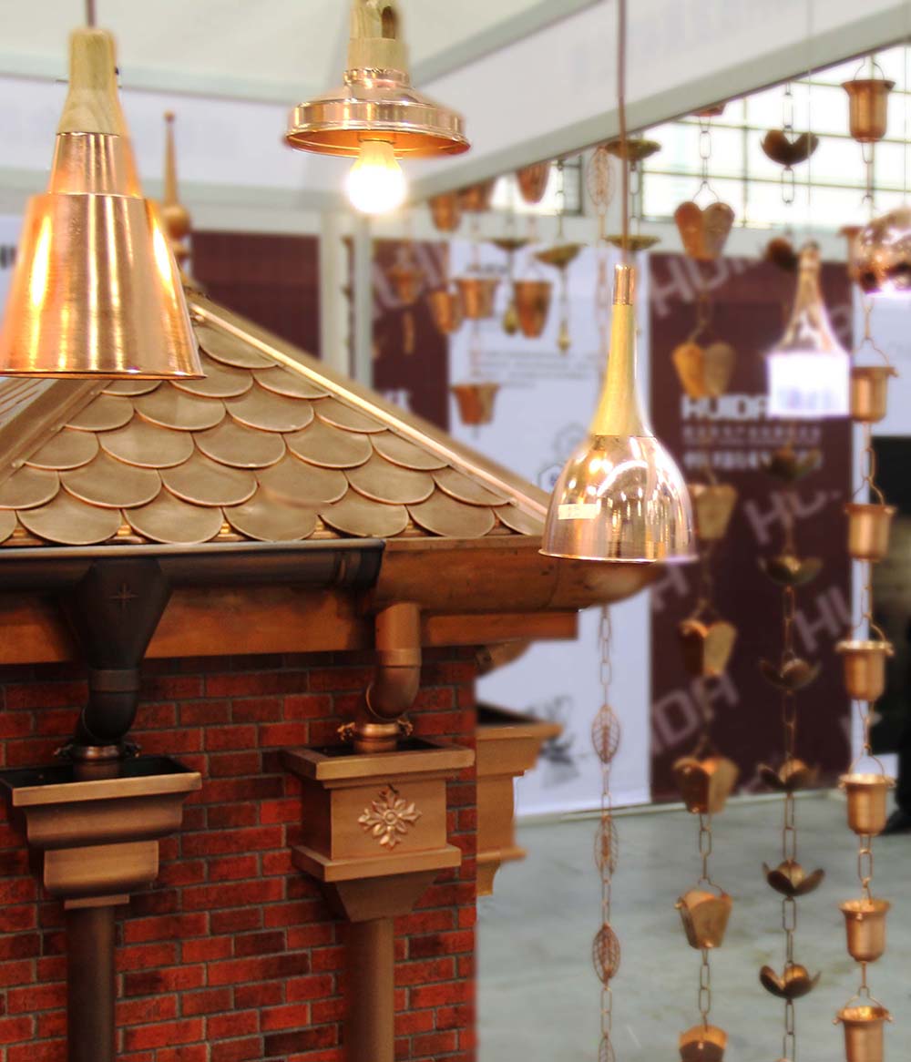 模拟的小房子近距离地向人们展示了天沟落水的工作原理,四个朝向分别向参展者显示了紫铜原色和复古铜色的天沟和雨水斗,模型真实再现建筑落水的空间维度。屋顶的铜瓦和铜尖顶则展示了建筑室外铜装饰的魅力,金属光泽耀眼迷人。