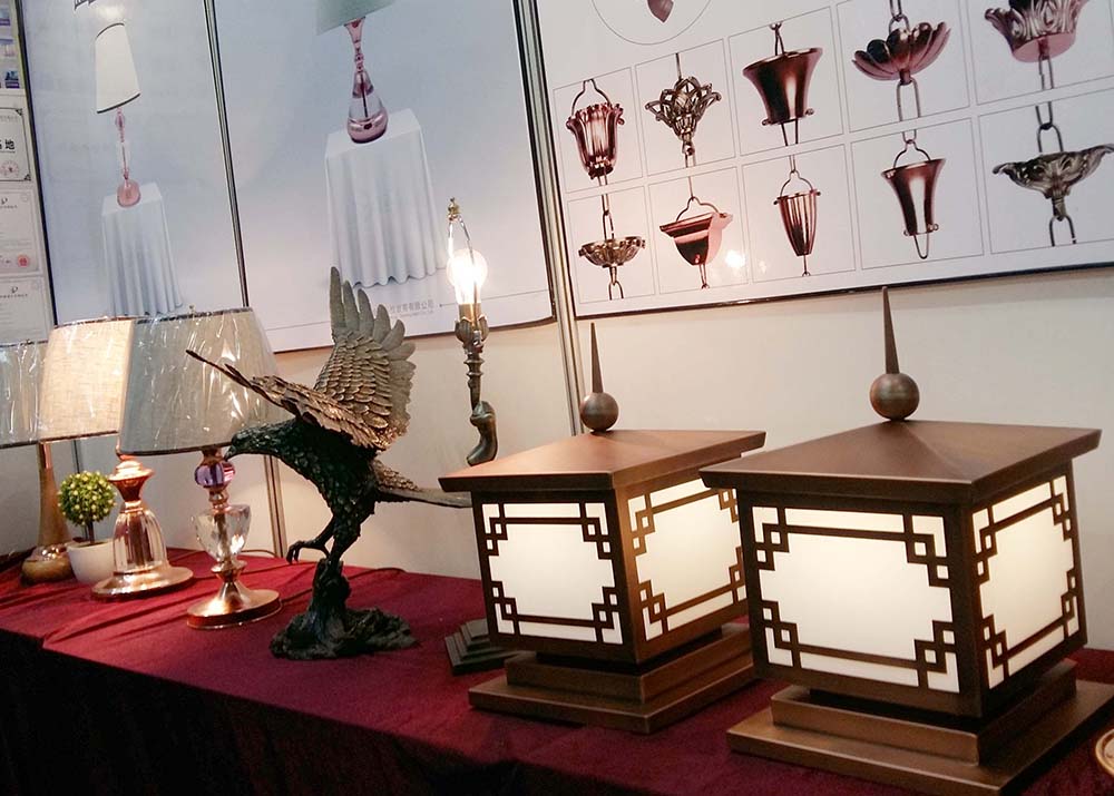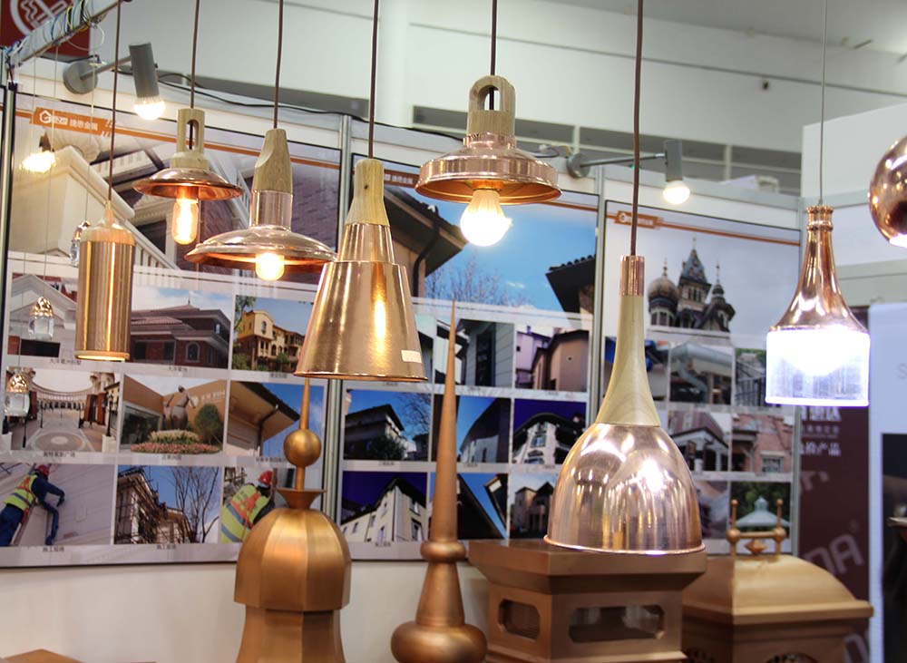 铜灯系列也是展会现场一大亮点,两个璀璨分明的紫铜水晶落地灯吸引眼球,两盏富有中华传统元素的室外柱头灯也颇受关注,用手触摸即可调节明暗以及开关的台灯令人们爱不释手,而铜吊灯散发的融融暖意则烘托了现场的整体氛围。
