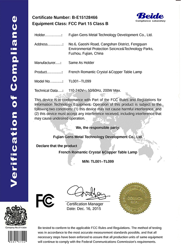 CE认证是一种安全认证标志,被视为制造商打开并进入欧洲市场的护照,是世界上专业的产品符合性评估模式。而FCC则是美国认证的标志,也是国内产品进出口必须取得的认证,捷思铜灯获得CE和FCC认证后便打下了欧美市场的基石,也为出口全世界做好了铺垫。