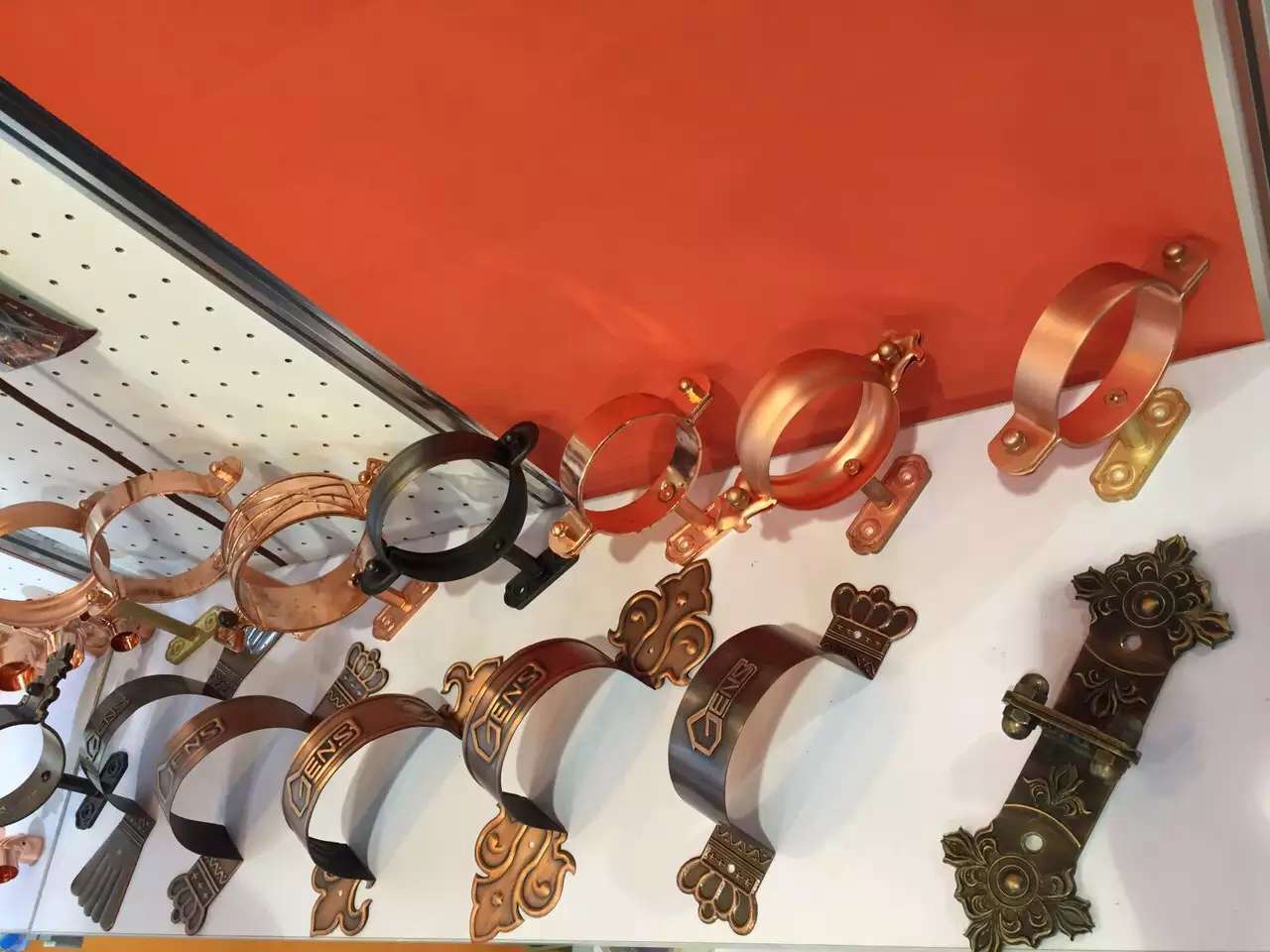 捷思单独展出落水的配件—管卡,精致对称的花纹样式,紫铜原色的闪耀,复古铜色的渲染以及那握在手中沉甸甸的质感都充分展示了管卡的品质。