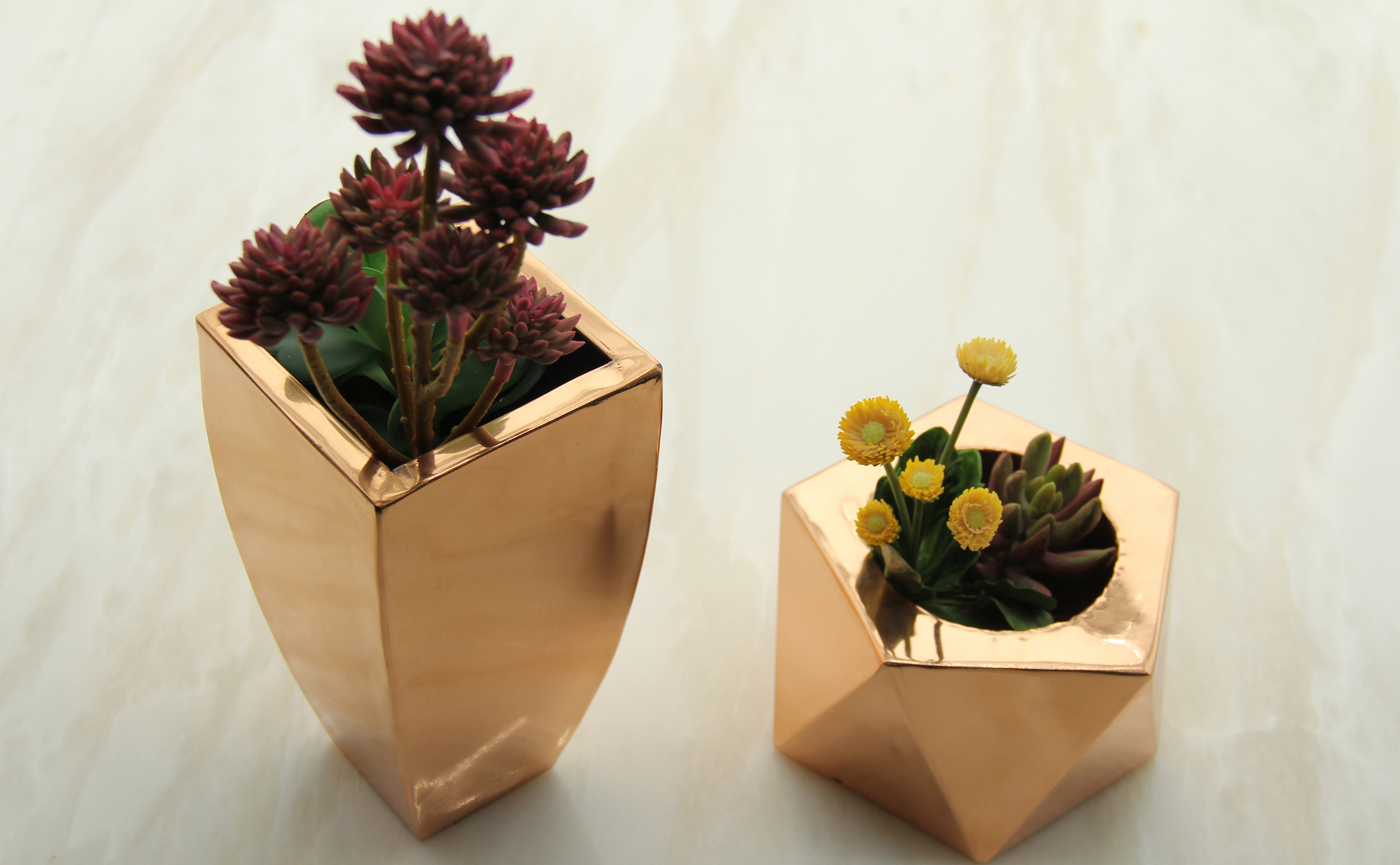 花盆种类繁多,常见的有瓦盆、陶盆,瓷盆等,瓦盆造型普通、工艺粗糙,陶盆,瓷盆虽更为美观,却易碰碎,不易于长期使用,铜花盆则显示出了独特的优势,细腻优雅的光泽,具有的抗腐性极利于栽花置景。