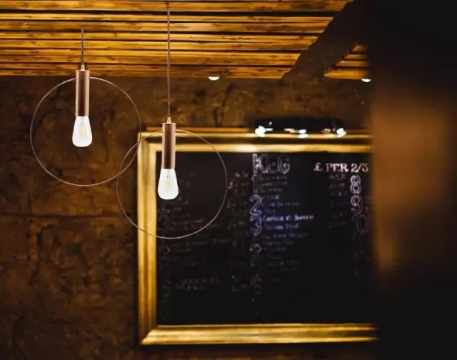 这款灯经捷思专业人员手工折弯的铜圈和简单灯泡组成,别看它其貌不扬的外表,当几盏灯或高或低的悬挂着,在酒吧、咖啡厅或是简约的家居空间中,都显得那么地创意十足。