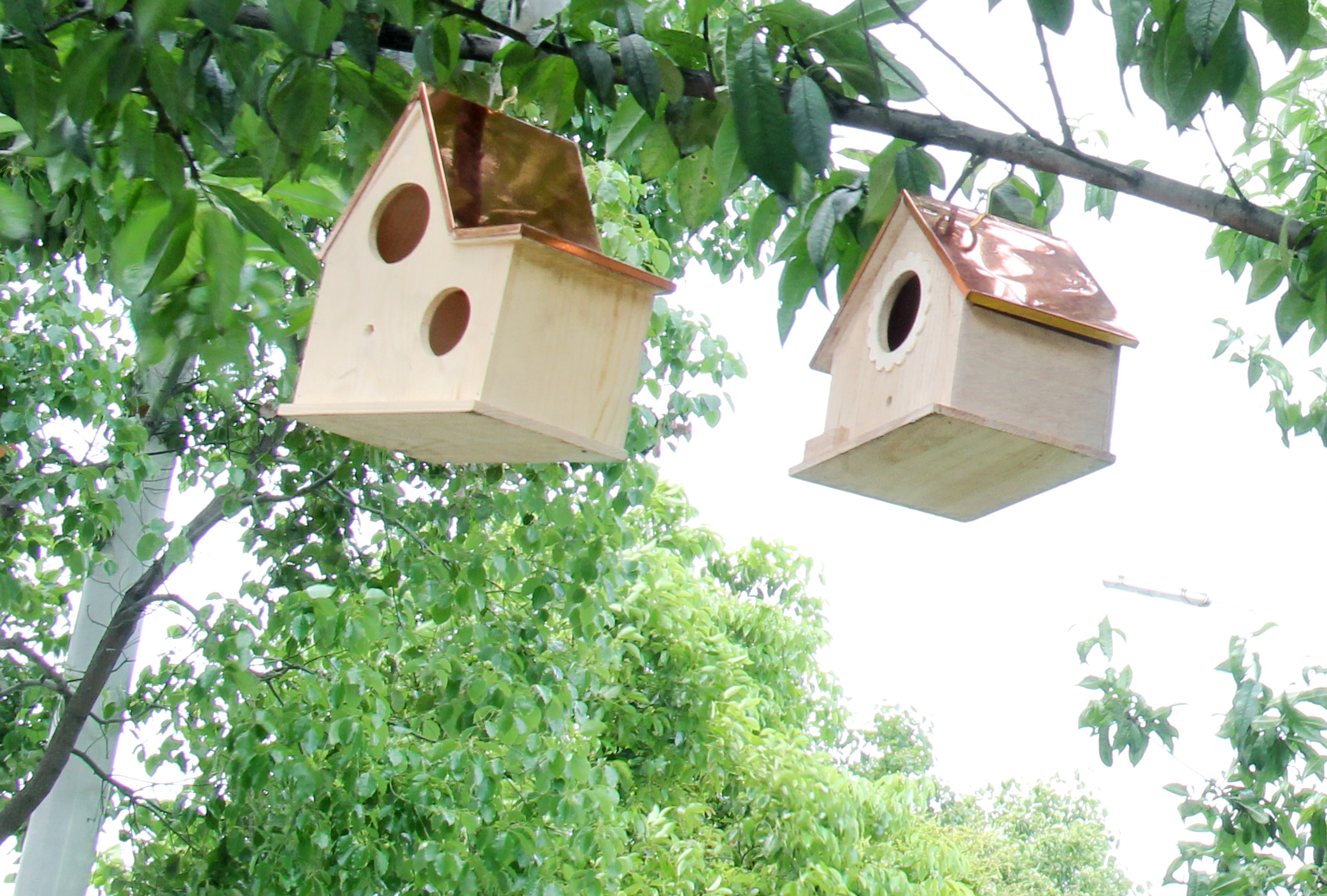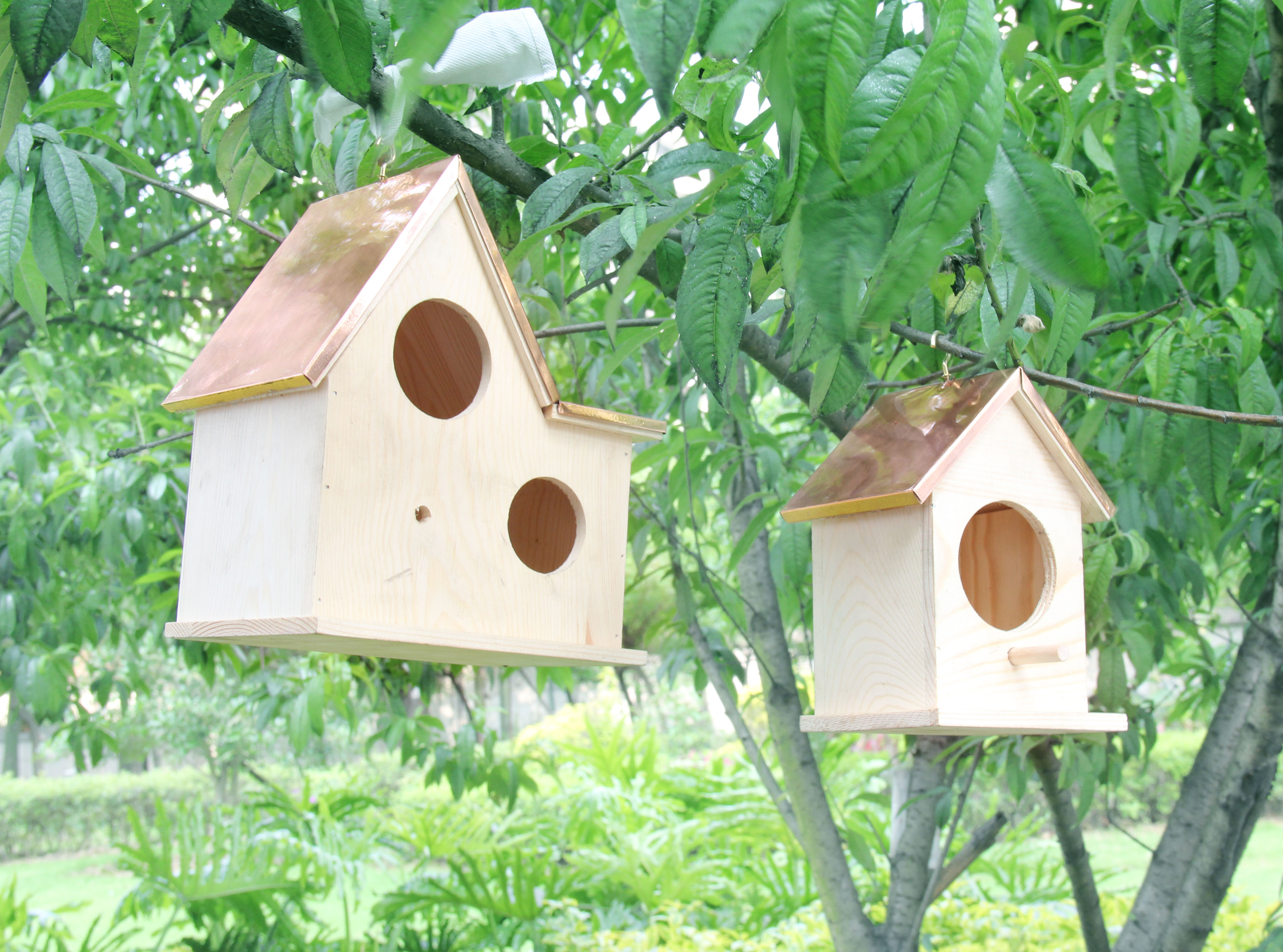 捷思鸟屋采用人性化的设计,仿造屋子的外形给予家的视感,屋身采用来自大自然的原始木材,屋顶则采用T2紫铜锻造成不同的立面形状。既有原木的自然纯粹,又有金属光泽的耀眼迷人,是鸟儿温馨舒适的住所。