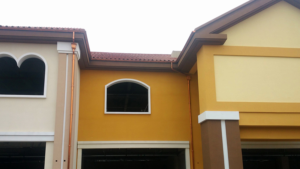 安装于外立面的金属落水系统无疑是建筑装饰,其优雅的铜色、垂直式的流畅线条、都符合欧式小镇简约的视觉美感。