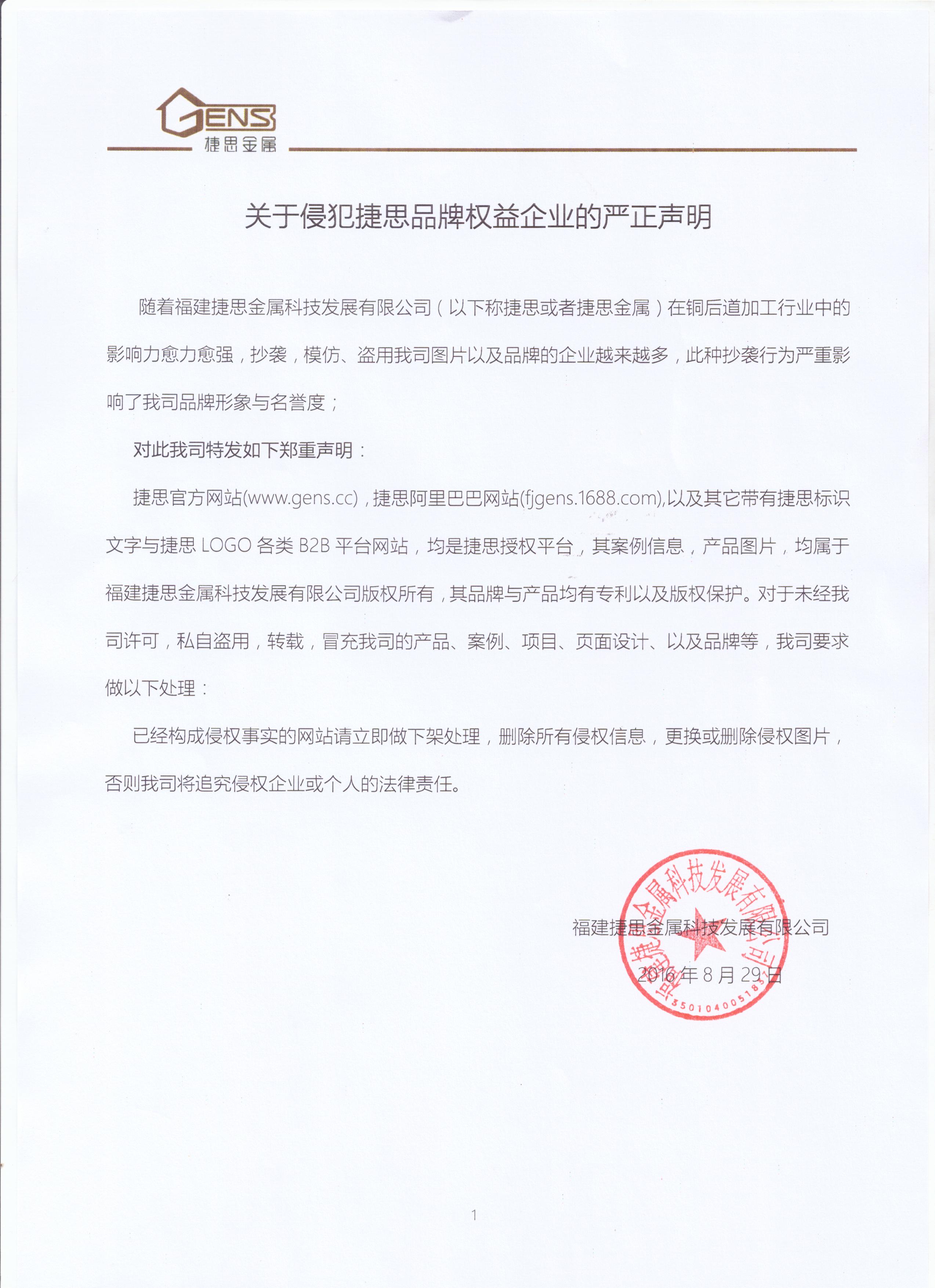 随着福建捷思金属科技发展有限公司(以下称捷思或者捷思金属)在铜后道加工行业中的影响力愈力愈强,抄袭,模仿、盗用我司图片以及品牌的企业越来越多,此种抄袭行为严重影响了我司品牌形象与名誉度。