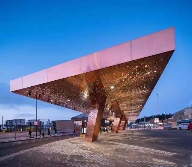 建筑为了更好的贴合周边环境,设计师精心挑选了建筑原料:铜、铝和玻璃。铜在其中发挥着主要的作用与使用量多。在玻璃表皮里面电梯的镀铜长柄与铜电缆。而它又优雅的呼应了大棚彰显力量感的流线轮廓。其他两座同样采用铜和玻璃的电梯塔位于地块的北部区域。 这两座电梯塔 串联了底层的街道与北侧 Mannerheiminkatu 的大巴站。它们共同营造了面向南侧城市的入口。