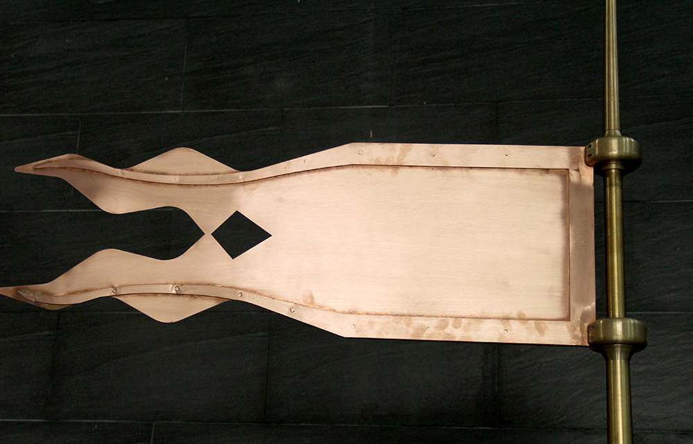 铜尖顶选用厚达一厘米的T2紫铜板铸造而成,采用预氧化技术进行表面处理,激光焊接缝隙,尖顶周身以及旗帜和圆球部分采用紫铜,旗杆部分则采用黄铜制作,色彩搭配合理,细节处理细腻,体现出设计者和制作者的用心,整体给人以震撼之感。