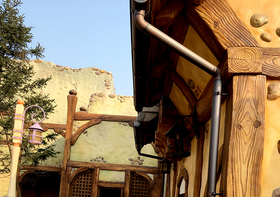 长时间的风吹雨打会令建筑渐渐地受到侵蚀,因此在迪斯尼的每处建筑都需安装金属落水系统来保护建筑,这也是为了乐园的长期成本效益而考虑。